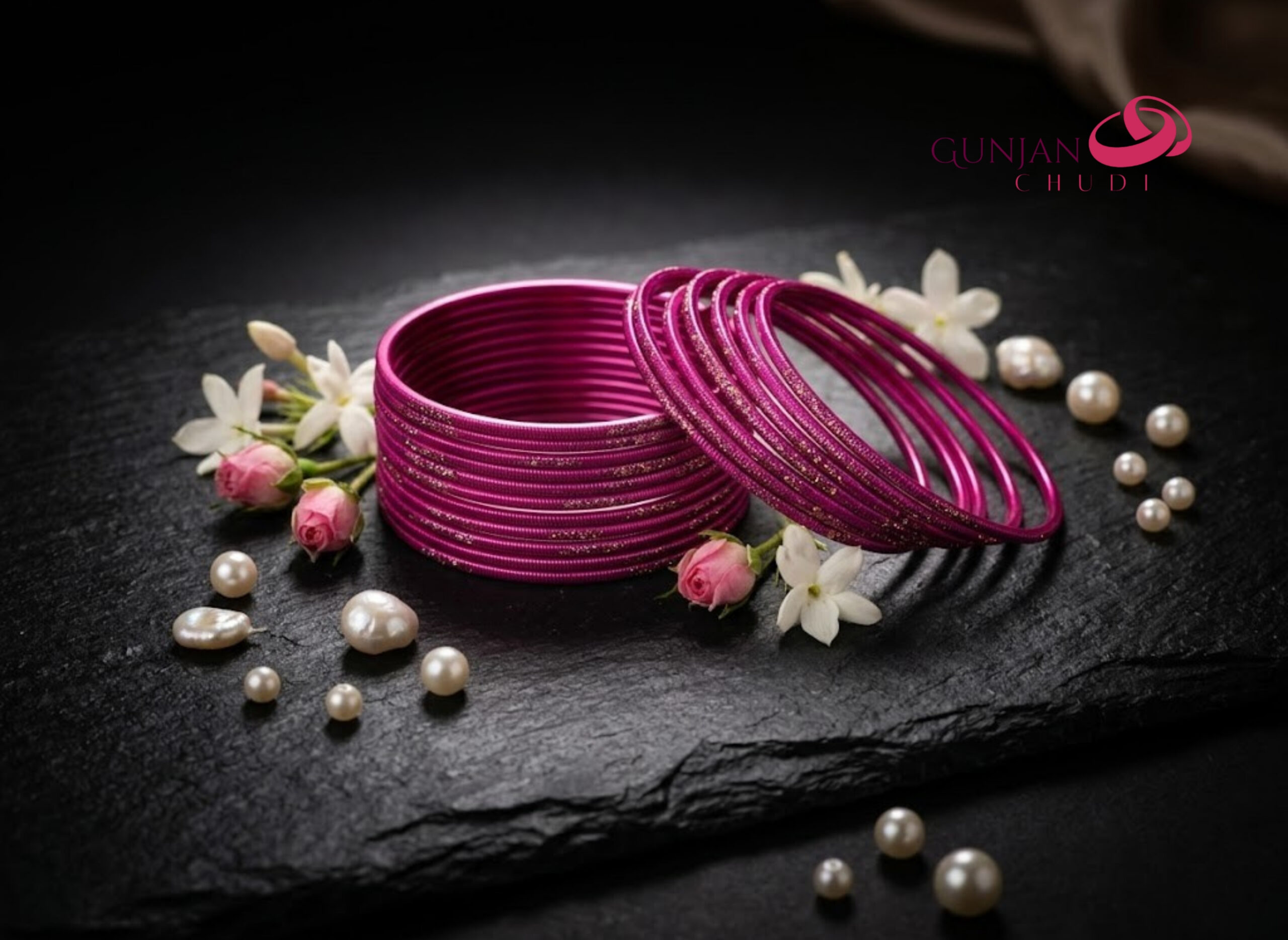 Stylish magenta velvet bangles enhanced with glitter dust detailing, designed to add sparkle and elegance to festive and traditional outfits. Perfect for weddings, parties, and special celebrations.